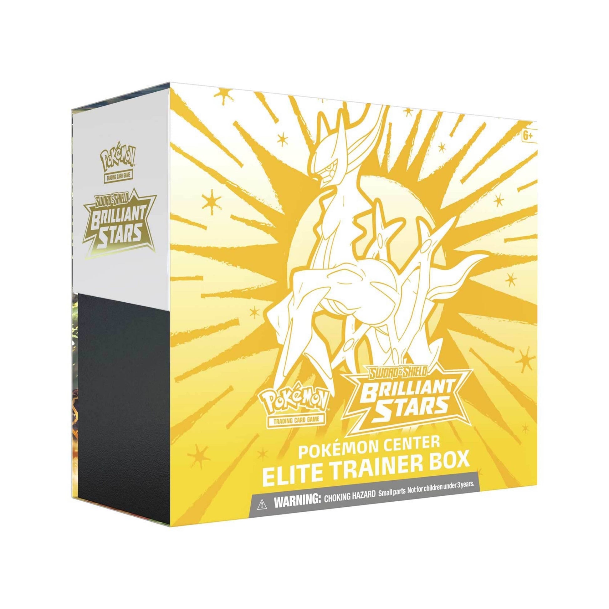 • 10 Pokémon TCG: Sword & Shield—Brilliant Stars booster packs • 65 card sleeves featuring Arceus • 45 Pokémon TCG Energy cards • A player’s guide to the Sword & Shield—Brilliant Stars expansion • A Pokémon TCG rulebook • 6 damage-counter dice • 1 competition-legal coin-flip die • 1 metallic coin featuring Arceus • 1 Vstar Token • 2 acrylic condition markers • A collector’s box to hold everything, with 4 dividers to keep it organized • A code card for the Pokémon Trading Card Game Online