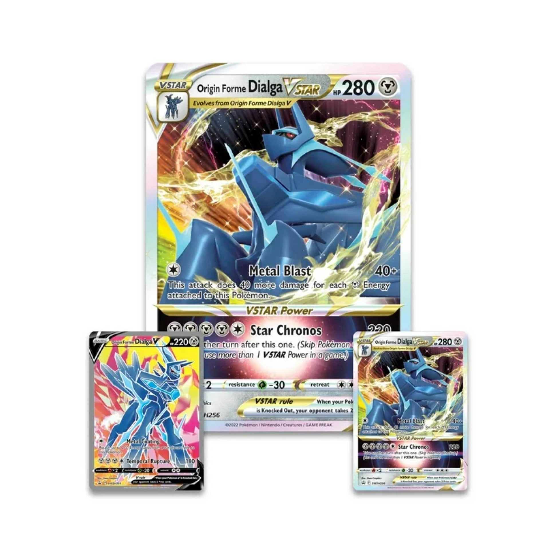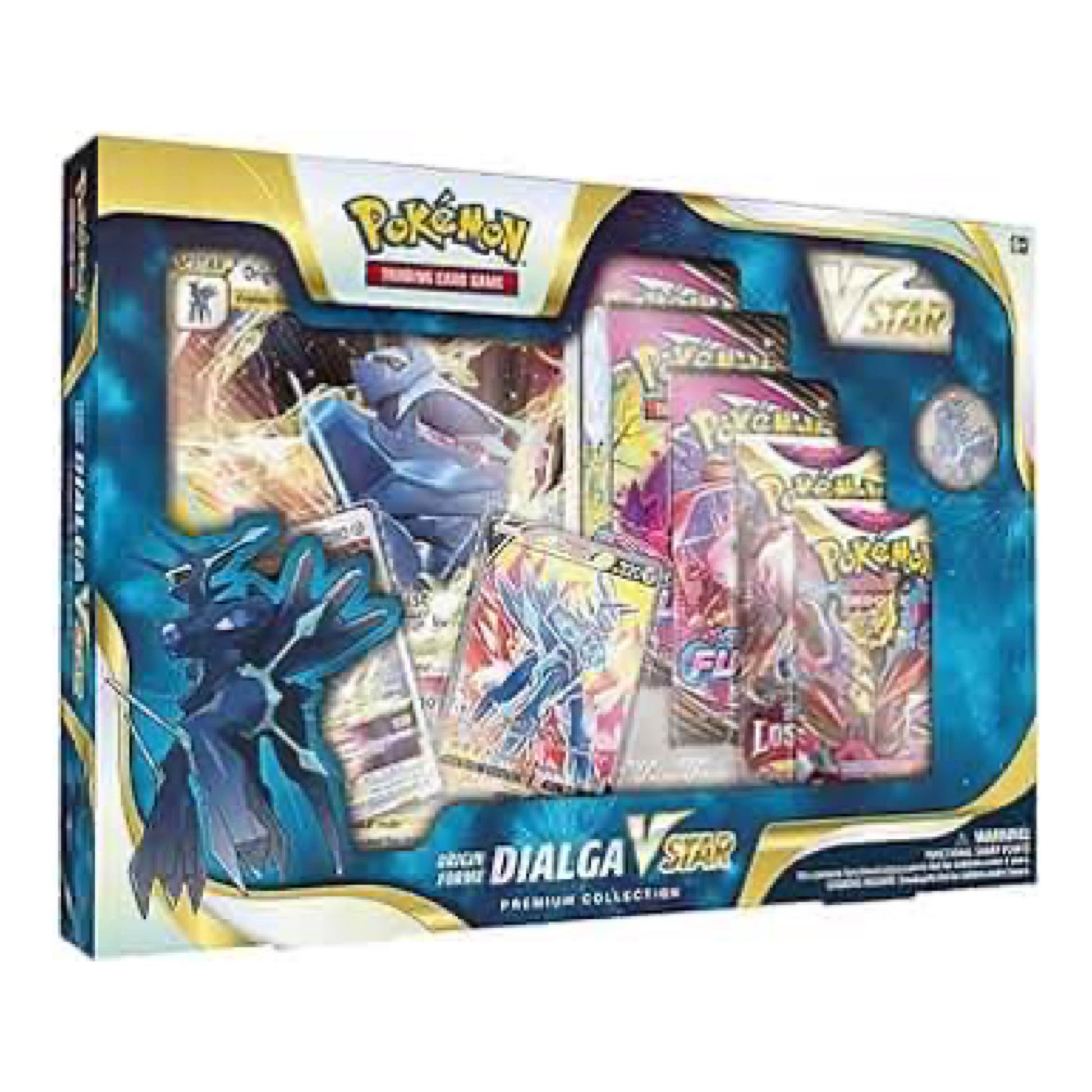 • 1 etched foil card featuring Origin Forme Dialga VSTAR or Origin Forme Palkia VSTAR • 1 etched foil card featuring Origin Forme Dialga V or Origin Forme Palkia V • 1 oversize foil card featuring Origin Forme Dialga VSTAR or Origin Forme Palkia VSTAR • 1 pin featuring Origin Forme Dialga or Origin Forme Palkia • 1 metallic coin featuring Origin Forme Dialga or Origin Forme Palkia • 6 Pokémon TCG booster packs • 1 acrylic VSTAR marker • A code card for Pokémon TCG Live